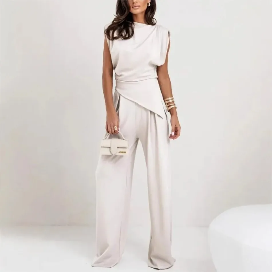 Sophisticated Asymmetrical 2-Piece Set – High-Rise Wide-Leg Pants