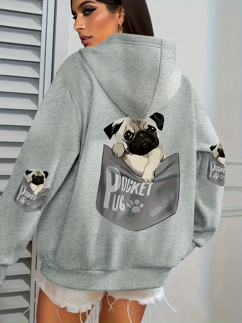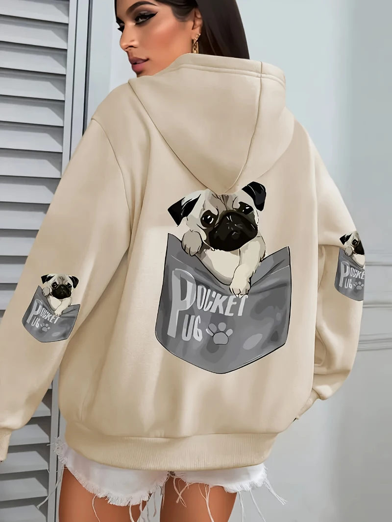 Cartoon Pug Pocket Print Hoodie – Women’s Loose Fit Fleece Pullover