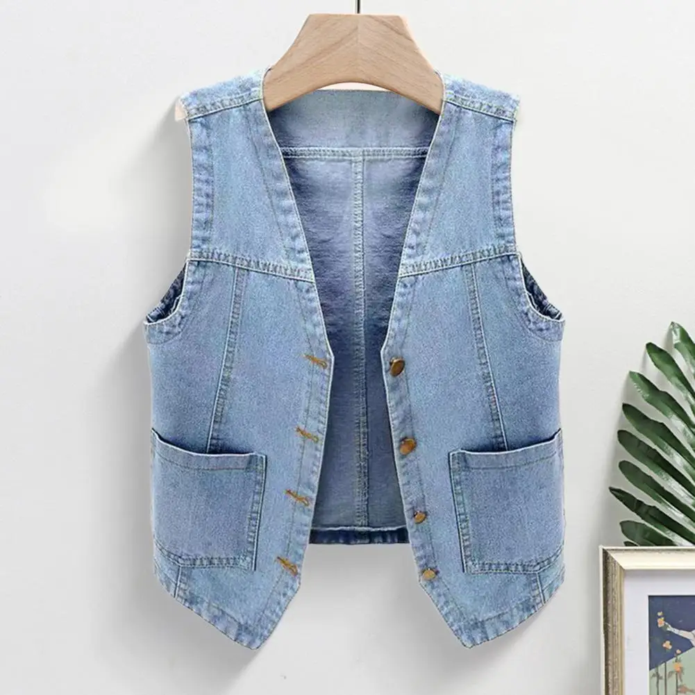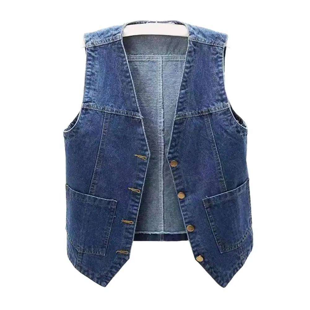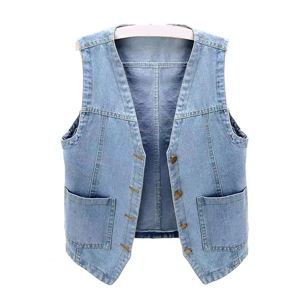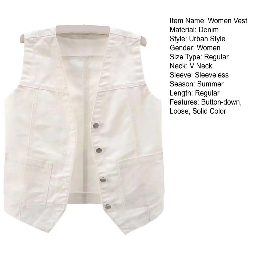 Women Denim Vest with Pockets Sleeveless Buton-down Loose Solid Color Cardigan V Neck Urban Style Waistcoat for Outdoor Travel Commuting