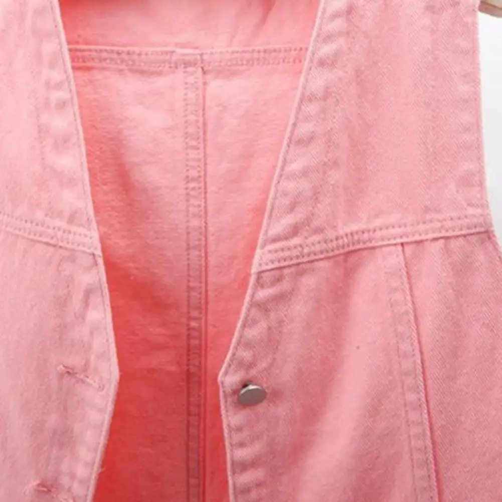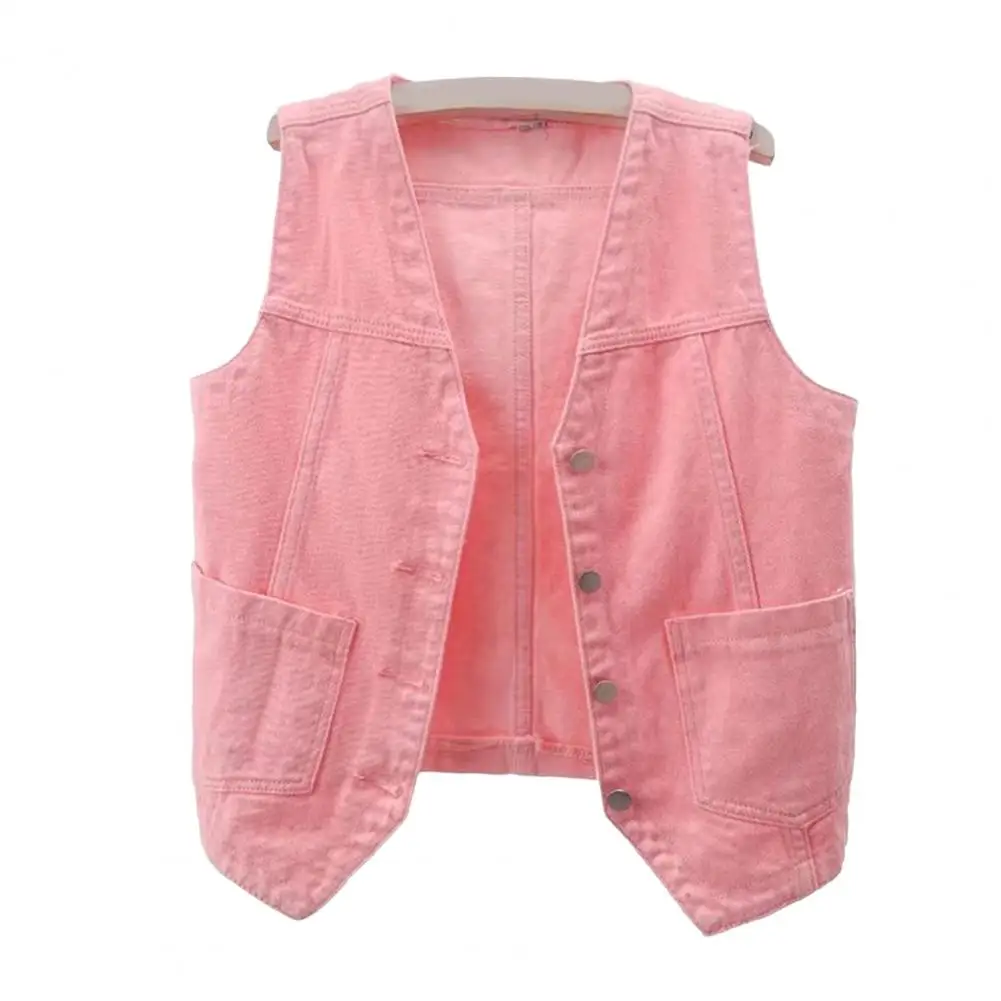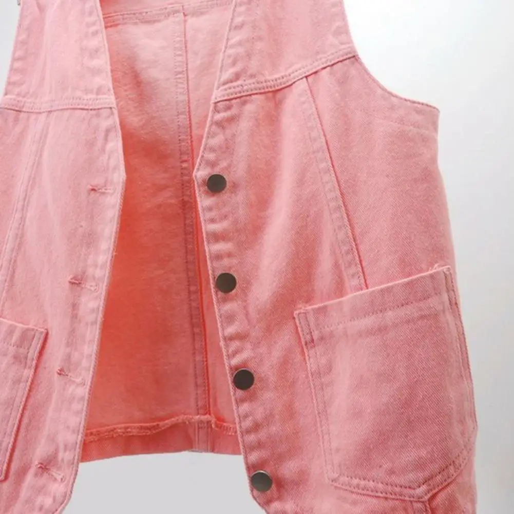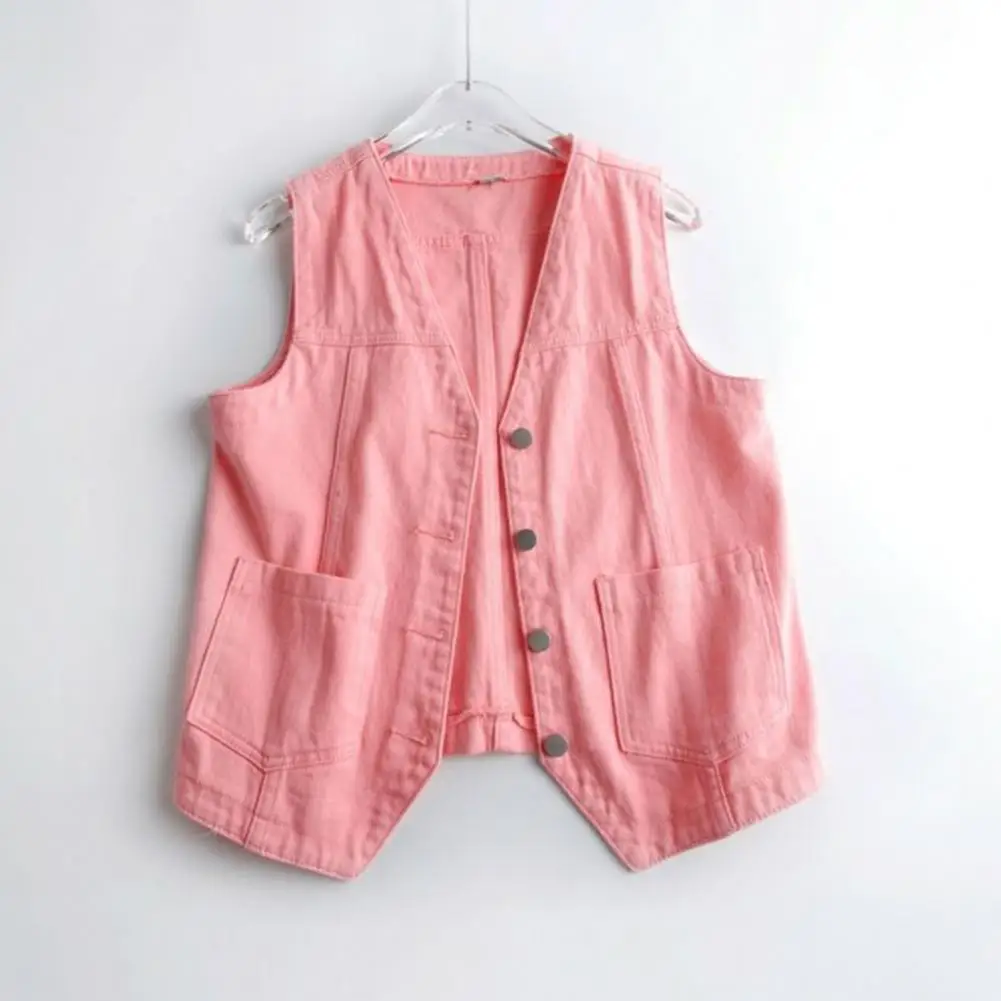 Women Denim Vest with Pockets Sleeveless Buton-down Loose Solid Color Cardigan V Neck Urban Style Waistcoat for Outdoor Travel Commuting