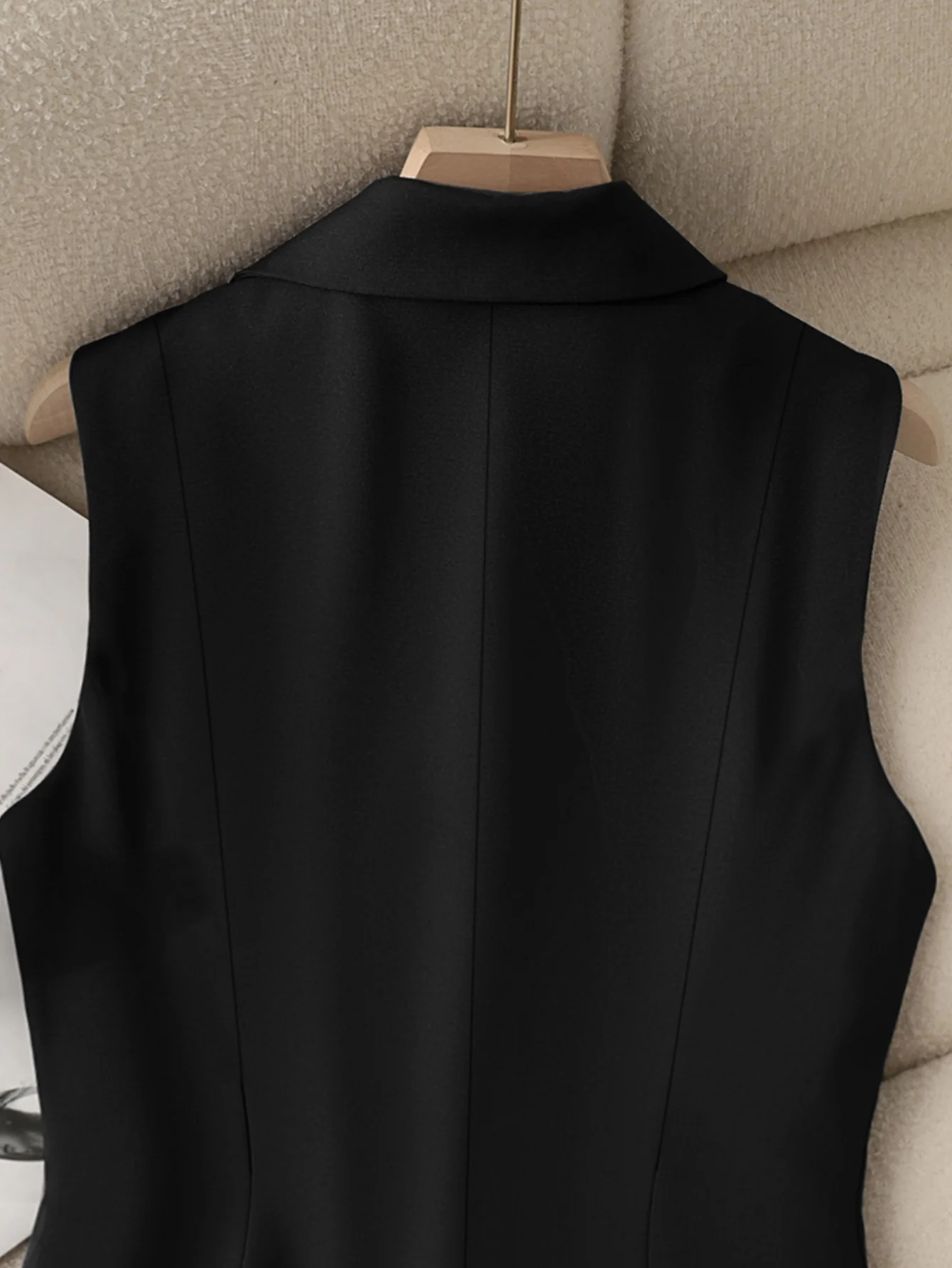 Crafted from a high-density, wrinkle-resistant suiting fabric, it drapes beautifully and maintains its crisp structure throughout the day. Whether layered over a classic button-down for the office or worn as a chic standalone top, this black vest is the versatile cornerstone your closet has been waiting for.